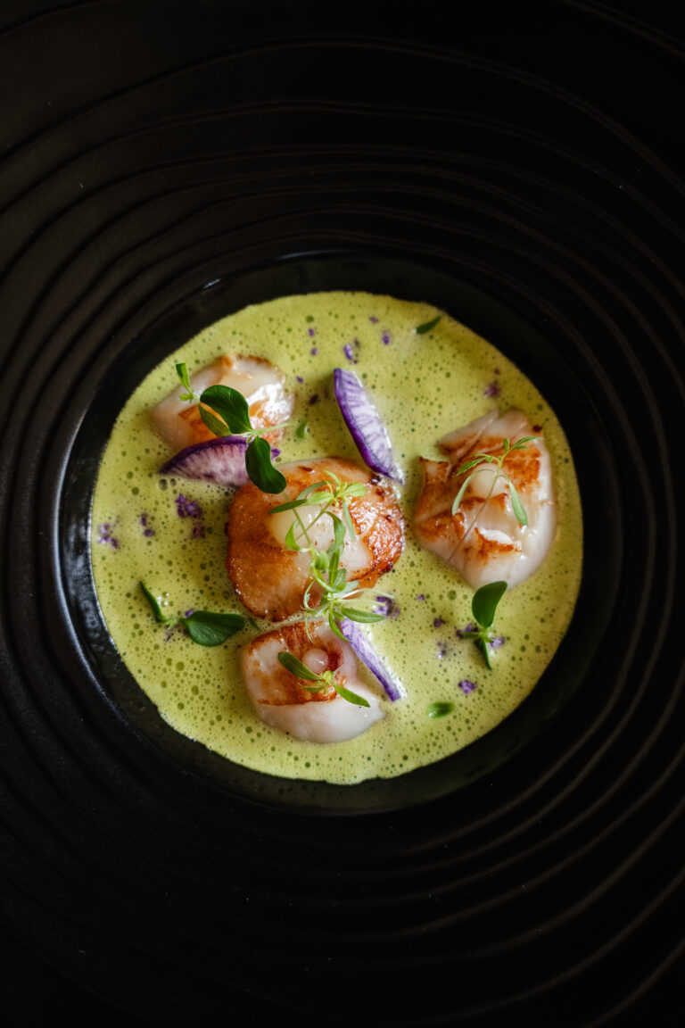 La noix de Saint-Jacques perlée au yuzu, chlorophylle marine