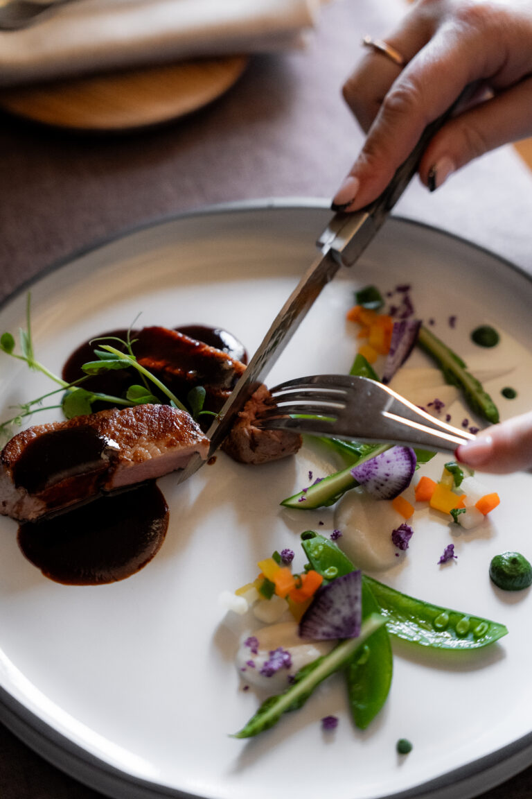 Filet de canard doré sur peau, jus réduit de ″brimbelles″